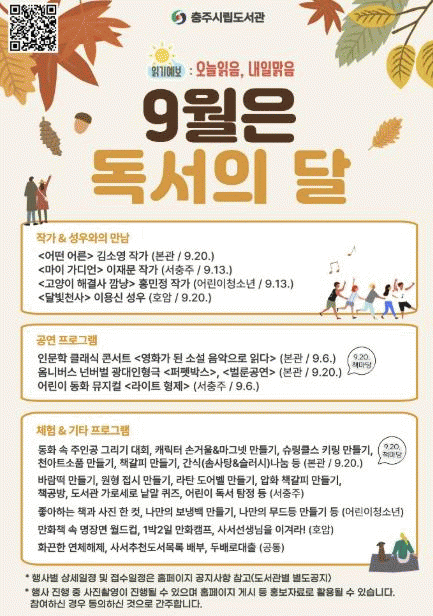 À̹ø µ¶¼ÀÇ ´Þ Çà»ç´Â ÃæÁֽà °ø°øµµ¼°ü 12°÷¿¡¼ 9¿ù ÇÑ ´Þ°£ ÁøÇàµÇ¸ç, ¡®Àб⿹º¸ : ¿À´ÃÀÐÀ½, ³»Àϸ¼À½¡¯À̶ó´Â ½½·Î°ÇÀ¸·Î ÀÛ°¡¿ÍÀÇ ¸¸³², °ø¿¬, üÇè, ´ëȸ, Àü½Ã µî ¿Â °¡Á·ÀÌ ÇÔ²² Áñ±æ ¼ö Àִ dz¼ºÇÑ ÇÁ·Î±×·¥ÀÌ ÁغñµÆ´Ù.