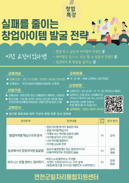 ÇÑÆí, ¿¬Ãµ±ºÀº ÈÄ¼Ó ±³À°À¸·Î 9¿ù 13ÀÏ ¡®½ÇÆÐ¸¦ ÁÙÀ̴ â¾÷¾ÆÀÌÅÛ ¹ß±¼ Àü·«¡¯ Ư°À» °³ÃÖÇÒ ¿¹Á¤ÀÌ´Ù. À̹ø °úÁ¤Àº â¾÷À» ÁغñÇÏÁö¸¸ ¾ÆÀÌÅÛ ¼±Á¤¿¡ ¾î·Á¿òÀ» °Þ´Â À̵éÀ» À§ÇØ ±âȹµÆÀ¸¸ç, â¾÷¾ÆÀÌÅÛ Çٽɱ¸Á¶ ºÐ¼®, Àϻ󿡼 ¾ÆÀÌÅÛ Ã£±â, ºñÁî´Ï½º ¸ðµ¨ ĵ¹ö½º Á¤¸®ÇÏ±â µî ½Ç½ÀÇü ±³À°À» ÅëÇØ â¾÷ ¾ÆÀ̵ð¾î¸¦ ±¸Ã¼ÈÇÏ´Â ±âȸ¸¦ Á¦°øÇÑ´Ù.
