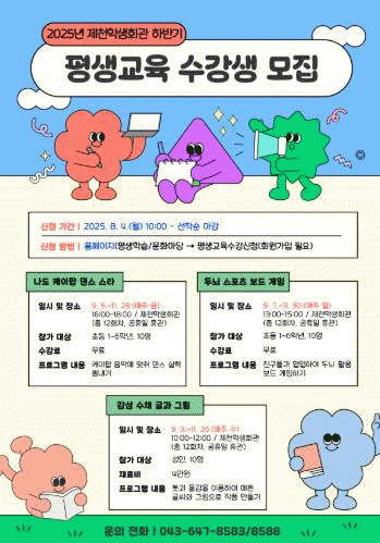 ÃʵîÇлýÀ» ´ë»óÀ¸·Î ÇÏ´Â ÇÁ·Î±×·¥À¸·Î´Â ¡ã'³ªµµ ÄÉÀÌÆË ´í½º ½ºÅ¸', ¡ã'µÎ³ú ½ºÆ÷Ã÷ º¸µå °ÔÀÓ'À» ¿î¿µÇØ ½Åü Ȱµ¿°ú »ç°í·Â Çâ»óÀ» Áö¿øÇϸç, Çкθð ¹× Áö¿ªÁֹΠ´ë»óÀ¸·Î´Â ¡ã'°¨¼º ¼öä ±Û°ú ±×¸²' ÇÁ·Î±×·¥À¸·Î ¿¹¼úÀ» ÅëÇÑ Á¤¼Àû ¾ÈÁ¤°ú Ãë¹Ì Ȱµ¿ÀÇ ±âȸ¸¦ Á¦°øÇÑ´Ù.