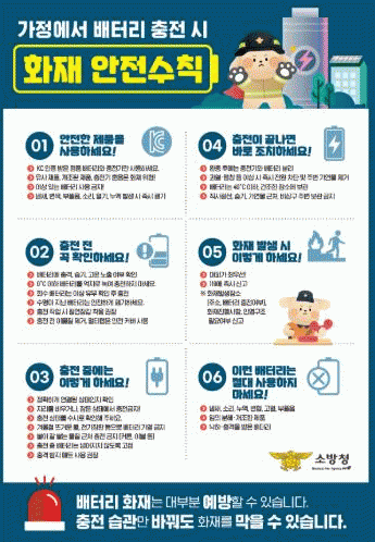 °Áø¼Ò¹æ¼´Â ±º¹ÎÀÌ ÀÏ»ó»ýȰ ¼Ó¿¡¼ ½ÇõÇÒ ¼ö ÀÖ´Â ¸®Æ¬À̿ ¹èÅ͸® ÈÀç ¿¹¹æ¼öÄ¢À¸·Î ¡âÀÎÁõ¹ÞÀº Á¦Ç°¸¸ »ç¿ë ¡âKC ÀÎÁõ µî ¾ÈÀüÀåÄ¡°¡ ºÎÂøµÈ ¹èÅ͸® ¹× ÃæÀü±â »ç¿ë ¡âÃæÀü Áß ÀÚ¸®¸¦ ºñ¿ìÁö ¾Ê±â ¡âÃëħ Áß ¶Ç´Â ¿ÜÃâ Áß ÃæÀü ±ÝÁö ¡âÅëdzÀÌ Àß µÇ´Â °÷¿¡¼ ÃæÀü ¡âÇö°ü, ºñ»ó±¸, ÃâÀÔ¹® ±Ùó ÃæÀü ±ÝÁö (ÈÀç ½Ã ´ëÇÇ·Î È®º¸ ºÒ°¡) ¡â°úÃæÀü ±ÝÁö ¡âÃæÀü ¿Ï·á ÈÄ Áï½Ã Àü¿ø Â÷´Ü ¹× ÄÚµå ºÐ¸® ¡â°í¿Â¡¤½À±â¡¤Á÷»ç±¤¼± ÇÇÇØ º¸°ü¡â 0~40¡É ÀÌÇÏÀÇ ¼´ÃÇÏ°í °ÇÁ¶ÇÑ Àå¼Ò¿¡ º¸°ü ¡â ¼Õ»óµÈ ¹èÅ͸®´Â Áï½Ã Æó±â ¡â ºÎÇ®À½, º¯Çü, ÀÌ»ó ¼Ò¸®, ¿¬±â, ´©¾× ¹ß»ý ½Ã Áï½Ã »ç¿ë Áß´Ü µîÀ» ¾È³»Çß´Ù.