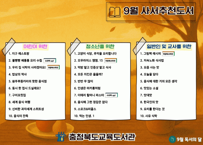 ¶ÇÇÑ, û¼Ò³âÀÌ À½½Ä¿¡ ¾ôÈù ´Ù¾çÇÑ À̾߱⠼ӿ¡¼ ¼¼´ë¿Í ¹®È¸¦ ³Ñ³ªµå´Â °æÇèÀ» Çϰí, »îÀ» ¹Ù¶óº¸´Â ½Ã¾ß¸¦ ³ÐÈú ¼ö ÀÖµµ·Ï ¡ã°í¾çÀÌ ½Ä´ç, Ãß¾ïÀ» ¿ä¸®ÇÕ´Ï´Ù(´ÙÄ«ÇϽà À¯Å¸ ; À±ÀºÇý ¿Å±è, ºóÆäÀÌÁö) ¡ã¿À¹«¶óÀ̽º ÀëÀë. 15(Á¶°æ±Ô, ¼Û¼ÛÃ¥¹æ) ¡ã¸Ô¹æ ¸»°í ÀÎÁõ¼¦ ¸»°í ½Ä»ç(Á¤Á¤Èñ ±Û ; ±è¿ìÇö ±×¸², õ°³Àǹٶ÷) µî 10±ÇÀ» ¼±Á¤Çß´Ù.