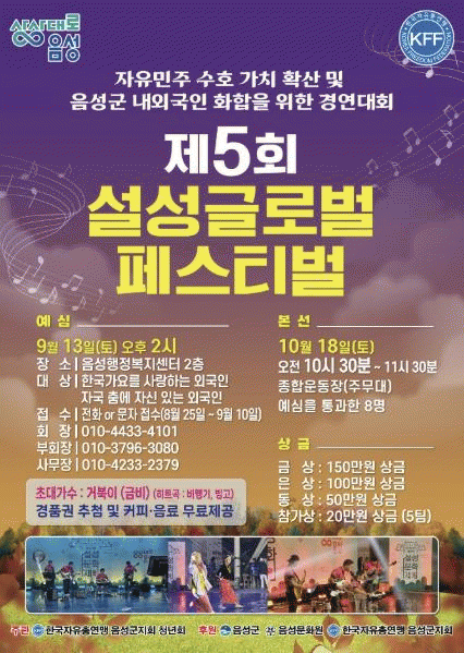 ¼³¼º ±Û·Î¹ú Æä½ºÆ¼¹úÀº ÀÚÀ¯¹ÎÁÖ ¼öÈ£ °¡Ä¡ È®»ê°ú À½¼º±ºÀÇ ³»¡¤¿Ü±¹ÀÎ ÈÇÕÀ» À§ÇÑ ±Û·Î¹ú °æ¿¬´ëȸ·Î, Âü°¡ ´ë»óÀº Çѱ¹°¡¿ä¸¦ »ç¶ûÇÏ´Â ¿Ü±¹Àΰú ÀÚ±¹ Ãã¿¡ ÀڽŠÀÖ´Â ¿Ü±¹ÀÎÀÌ´Ù.