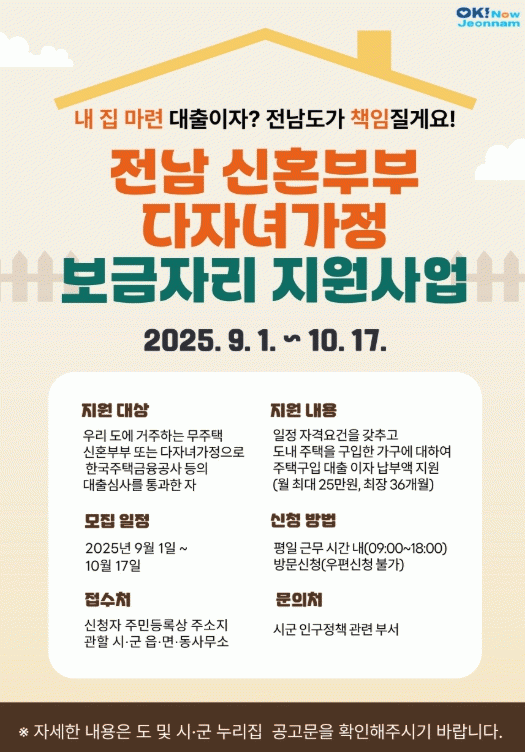 ½ÅÈ¥ºÎºÎ¡¤´ÙÀڳడÁ¤ º¸±ÝÀÚ¸® Áö¿ø»ç¾÷Àº Àü³²¿¡ °ÅÁÖÇÏ´Â ¹«ÁÖÅà ½ÅÈ¥ºÎºÎ¿Í 2ÀÚ³à ÀÌ»ó ´ÙÀڳడÁ¤À» ´ë»óÀ¸·Î ÁÖÅà ±¸ÀÔ ´ëÃâÀÌÀÚ ÀϺθ¦ ÃÖ´ë 36°³¿ù°£ ¿ù 25¸¸ ¿ø±îÁö Áö¿øÇÏ´Â Á¤Ã¥ÀÌ´Ù.