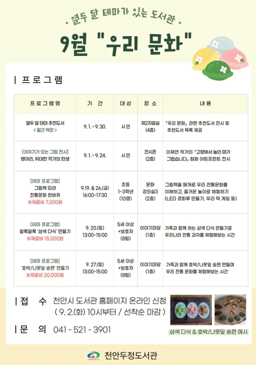 ÀÌ¿Í ÇÔ²² ¿À´Â 9¿ù 19Àϰú 26ÀÏ¿¡´Â ±×¸²Ã¥À¸·Î ¿ì¸® ÀüÅë ¹®È¸¦ ¸¸³ª°í ³îÀ̷ΠüÇèÇÏ´Â ¡®±×¸²Ã¥ µû¶ó ÀüÅë¹®È ÇÑ ¹ÙÄû¡¯¸¦ ¿î¿µÇÑ´Ù. 9¿ù 20Àϰú 27ÀÏ¿¡´Â °¡Á·ÀÌ ÇÔ²² »ï»ö ´Ù½Ä°ú È£¹Ú¡¤³ª¹µÀÙ ¼ÛÆíÀ» ¸¸µé¾îº¸´Â üÇèÇü ÇÁ·Î±×·¥À» ÁøÇàÇÒ ¿¹Á¤ÀÌ´Ù.