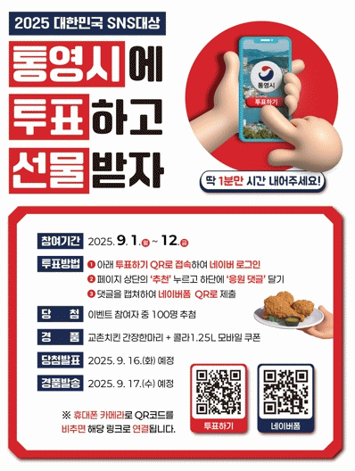 À̹ø ÅõÇ¥ À̺¥Æ®´Â Àü ±¹¹Î ´©±¸³ª Âü¿©ÇÒ ¼ö ÀÖÀ¸¸ç, ´ëÇѹα¹ SNS´ë»ó ȨÆäÀÌÁö¿¡¼ ³×À̹ö °£Æí ·Î±×ÀÎÀ» ÅëÇØ Å뿵½Ãû ÅõÇ¥ ÆäÀÌÁö¿¡ Á¢¼ÓÇÑ µÚ »ó´ÜÀÇ ¡®Ãßõ¡¯ ¹öưÀ» Ŭ¸¯Çϰí ÀÀ¿ø ´ñ±ÛÀ» ÀÛ¼ºÇÏ¸é µÈ´Ù. ÀÌÈÄ ÇØ´ç ȸéÀ» Ä¸Ã³ÇØ À̺¥Æ® ÀÀ¸ð ÆäÀÌÁö¿¡ µî·ÏÇϸé Âü¿©°¡ ¿Ï·áµÈ´Ù.