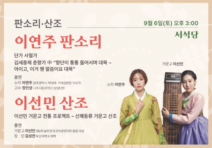 µÎ ¹øÂ° ¹«´ë´Â ¼Ò¸®²Û ÀÌ¿¬ÁÖÀÇ ÆÇ¼Ò¸® 'ÃáÇâ°¡'´Ù. ÀÌ¿¬ÁÖ´Â Áß¾Ó´ëÇб³ ÀϹݴëÇпø Çѱ¹À½¾ÇÇаú¿¡¼ ÆÇ¼Ò¸®¸¦ Àü°øÇßÀ¸¸ç, Áøµµ±º¸³¹Î¼Ó¿¹¼ú´Ü »óÀÓ´Ü¿øÀ» ¿ªÀÓÇß´Ù. ÇöÀç´Â ±¤ÁÖ±¤¿ª½Ã Á¦18È£ °¡¾ß±Ýº´Ã¢ À̼öÀڷΠȰµ¿Çϸç, ÆÇ¼Ò¸®¿Í °¡¾ß±Ýº´Ã¢À» ¾Æ¿ì¸£´Â Æø³ÐÀº ¿¹¼úÀû ½ºÆåÆ®·³À» º¸¿©ÁÖ°í ÀÖ´Ù.