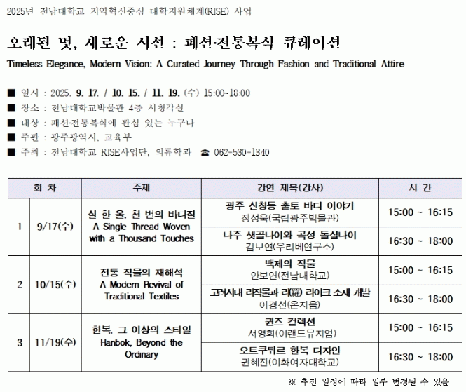 1ÀÏ Àü³²´ëÇб³´Â Àü³²´ëÇб³´Â Áö¿ª°ú ´ëÇÐÀÇ µ¿¹Ý ¼ºÀåÀ» À̲ô´Â RISE »ç¾÷´Ü°ú ÀÇ·ùÇаú°¡ °øµ¿ ÁÖÃÖÇÏ´Â ¡®¿À·¡µÈ ¸Ú, »õ·Î¿î ½Ã¼±: ÆÐ¼Ç?ÀüÅ뺹½Ä Å¥·¹ÀÌ¼Ç ±³À° ÇÁ·Î±×·¥¡¯À» ¸¶·ÃÇØ, ¿À´Â 9¿ù 17ÀÏ¡¤10¿ù 15ÀÏ¡¤11¿ù 19ÀÏ ¼¼ Â÷·Ê¿¡ °ÉÃÄ ¿©¼¸ °¡Áö ÁÖÁ¦ °¿¬À» ÁøÇàÇÑ´Ù°í ¹àÇû´Ù.