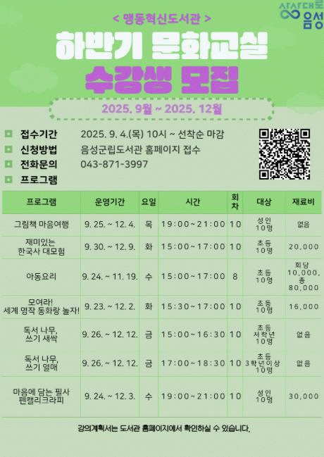 À̹ø ¹®È ±³½ÇÀº ¼ºÀΰú ÃʵîÇлýÀ» ´ë»óÀ¸·Î 7°³ °Á¸¦ °³¼³ÇØ 9¿ùºÎÅÍ 12¿ù±îÁö ¿î¿µµÈ´Ù.