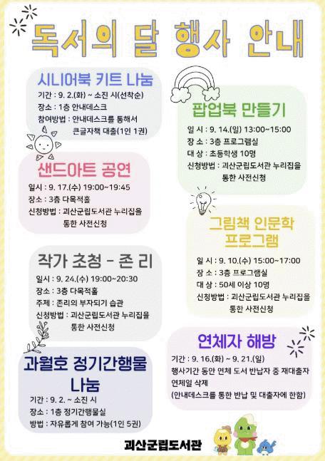 ÁÖ¿ä ÇÁ·Î±×·¥À¸·Î´Â ¡â¿¬·Éº° Ãßõµµ¼¸¦ Àü½ÃÇÏ´Â ¡®Ã¥GPT¡¯ ¡âÅ«±ÛÀÚ µµ¼ ´ëÃâÀÚ¸¦ ´ë»óÀ¸·Î ÇÑ ¡®½Ã´Ï¾îºÏ ¸¸µé±â ŰƮ¡¯ ¼±Âø¼ø ¹èºÎ ¡âµµ¼°ü ÀÌ¿ëÀÚ¸¦ À§ÇÑ ¡®°ú¿ùÈ£ Á¤±â°£Ç๰ ³ª´®¡¯ ¡âµµ¼ ¿¬Ã¼ÀÚ¸¦ À§ÇÑ ¡®¿¬Ã¼ÀÚ ÇØ¹æ¡¯ À̺¥Æ®°¡ ÀÖ´Ù.