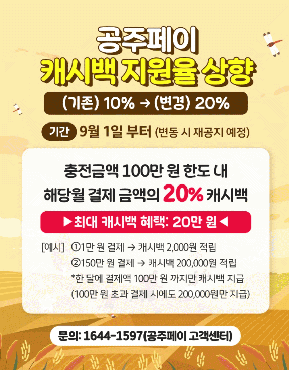 ÀÌ¿¡ µû¶ó ÃæÀüÀϰú °ü°è¾øÀÌ ¿ù 100¸¸ ¿ø Çѵµ ³»¿¡¼ ÇØ´ç ¿ù¿¡ °øÁÖÆäÀÌ·Î °áÁ¦ÇÑ ±Ý¾×ÀÇ 20%°¡ ij½Ã¹éÀ¸·Î Á¦°øµÇ¸ç, ¿ù ÃÖ´ë 20¸¸ ¿ø±îÁö ÇýÅÃÀ» ¹ÞÀ» ¼ö ÀÖ´Ù.