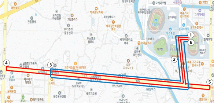 ¿ÀÀü 10½Ã ¾ÖÇâ¿îµ¿Àå¿¡¼ Ãâ¹ßÇØ º¸°Ç¼Ò »ç°Å¸®¿Í JIBS Á¦ÁÖ¹æ¼Û, ¸¶¸®³ª »ç°Å¸®¸¦ °æÀ¯ÇÏ´Â ¿Õº¹ 5§° ÀÚÀü°Å ÄÚ½º¿Í 4§° °È±â ÄÚ½º°¡ ¸¶·ÃµÈ´Ù.