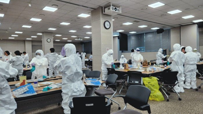 ¾Æ¿ï·¯ ÇöÀå±Ù¹« ÀηÂÀÇ °¨¿°¿¹¹æ°ú ¹æ¿ªÀη¿¡ ÀÇÇÑ ÀüÆÄ Â÷´ÜÀ» À§ÇØ °³Àκ¸È£±¸ Âø¡¤Å»Àǹý ±³À° ¹× ½Ç½Àµµ º´ÇàµÆ´Ù.