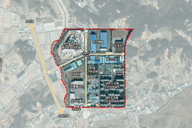 ´ëÀüÁ¾ÇÕ¹°·ù´ÜÁö´Â 2003³â À¯¼º±¸ ´ëÁ¤µ¿ ÀÏ¿ø 46¸¸§³ ±Ô¸ð·Î Á¶¼ºµÅ, ÇöÀç ÇÑÁø ´ëÀü½º¸¶Æ® ¸Þ°¡ÇãºêÅ͹̳ΰú ¸ð´Ù¾Æ¿ï·¿ µî 25°³ ¹°·ù¡¤À¯Åë±â¾÷ÀÌ ÀÔÁÖÇÑ Áö¿ª ÇÙ½É °ÅÁ¡ÀÌ´Ù.