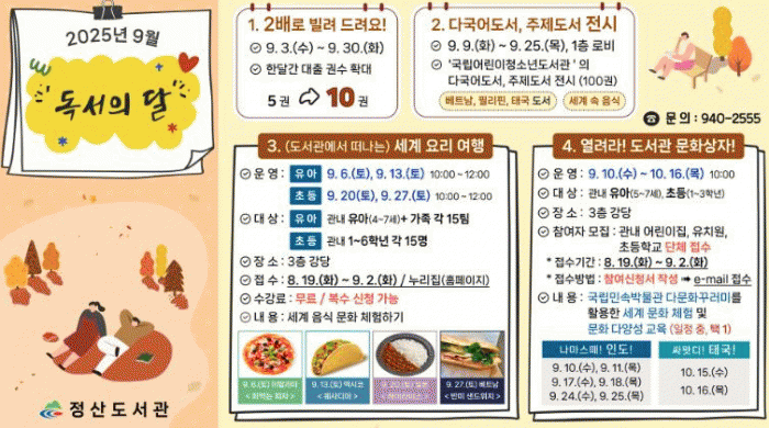 ¶Ç ¿À´Â 9ÀϺÎÅÍ 25ÀϱîÁö´Â µµ¼°ü 1Ãþ ·Îºñ¿¡¼ º£Æ®³², Çʸ®ÇÉ, ű¹ µî ´Ù±¹¾î µµ¼ 80±Ç°ú ¡®¼¼°è ¼Ó À½½Ä¡¯À» ÁÖÁ¦·Î ÇÑ µµ¼ 20±Ç µî ÃÑ 100±ÇÀ» Àü½ÃÇØ ´Ù¹®È °¨¼ö¼º°ú µ¶¼ Èï¹Ì¸¦ ÇÔ²² ³ôÀÏ ¿¹Á¤ÀÌ´Ù.