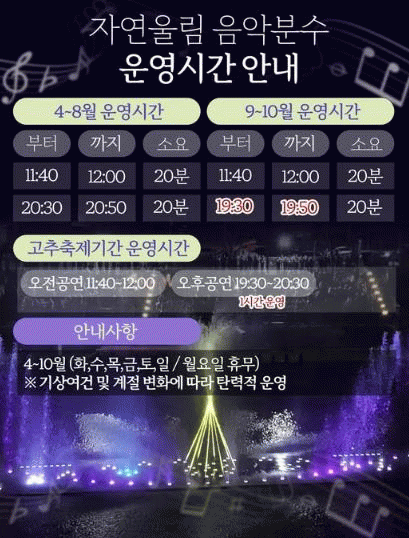 ±«»ê´ë±³ ÇÏ»ó ºÎÁö¿¡ Á¶¼ºµÈ ÀÚ¿¬¿ï¸² À½¾ÇºÐ¼ö´Â ÃÖ´ë 30m ³ôÀÌÀÇ ¹°ÁÙ±â¿Í ÇÔ²² LED Á¶¸í, ¿öÅͽºÅ©¸° ¿µ»ó, Ŭ·¡½Ä¡¤Æ®·ÎÆ®¡¤´ëÁß°¡¿ä µî ÃÑ 28°îÀÇ À½¾ÇÀÌ ¾î¿ì·¯Áö´Â °ø¿¬Çü ½Ã¼³·Î, ÇÏ·ç 200¿© ¸íÀÌ ¹æ¹®Çϸç Áö¿ªÀÇ ´ëÇ¥ °ü±¤ ¸í¼Ò·Î ÀÚ¸®Àâ°í ÀÖ´Ù.
