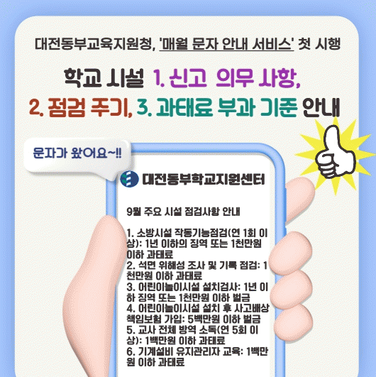 µ¿ºÎ Çб³Áö¿ø¼¾ÅÍ´Â Çб³ ½Ã¼³ÀÇ ½Å°í Àǹ« »çÇ×, Á¡°Ë ÁÖ±â, °úÅÂ·á ºÎ°ú ±âÁØÀ» ü°èÀûÀ¸·Î Á¤¸®ÇØ ¸Å¿ù ÃÊ ¹®ÀÚ·Î ¹ß¼ÛÇϸç, ±ä±ÞÇÑ »ç¾ÈÀº ¼ö½Ã ¾È³»µµ º´ÇàÇÒ °èȹÀÌ´Ù.
