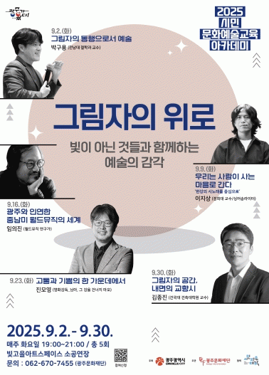 ¿ÃÇØ ¾ÆÄ«µ¥¹Ì´Â ¡®±×¸²ÀÚÀÇ À§·Î-ºûÀÌ ¾Æ´Ñ °Íµé°ú ÇÔ²²ÇÏ´Â ¿¹¼úÀÇ °¨°¢¡¯À» ÁÖÁ¦·Î 9¿ù ÇÑ ´Þ°£ ¸ÅÁÖ È¿äÀÏ ÃÑ 5ȸ ÁøÇàµÈ´Ù. öÇС¤¹®ÇС¤À½¾Ç¡¤¿µÈ¡¤°ÇÃàÀ» ¾Æ¿ì¸£´Â ´Ùä·Î¿î °¿¬°ú °ø¿¬ÀÌ ¸¶·ÃµÇ¸ç, ±¤ÁÖ¹®ÈÀç´Ü°ú (»ç)Àι®µµ½Ã¿¬±¸¿ø ½Ã¹ÎÀÚÀ¯´ëÇÐÀÌ Çù·ÂÇØ ÃßÁøÇÑ´Ù.