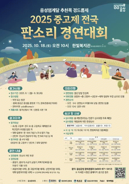 ±ºÀº ÃʵîºÎ, Áß¡¤°íµîºÎ, ´ëÇС¤ÀϹݺÎ, ½ÅÀκΠµî 4°³ ºÎ¹®À¸·Î ³ª´² 9¿ù 30ÀϱîÁö Âü°¡ÀÚ¸¦ ¸ðÁýÇϸç, °æ¿¬´ëȸ Âü°¡ÀÚµéÀº ÃáÇâ°¡, Èﺸ°¡, ¼ö±Ã°¡, ½Éû°¡, Àûº®°¡ 5¹ÙÅÁ Áß ÀÚÀ¯°îÀ» 10ºÐ ³»¿Ü·Î °æ¿¬À» ÆîÄ¥ ¿¹Á¤ÀÌ´Ù.