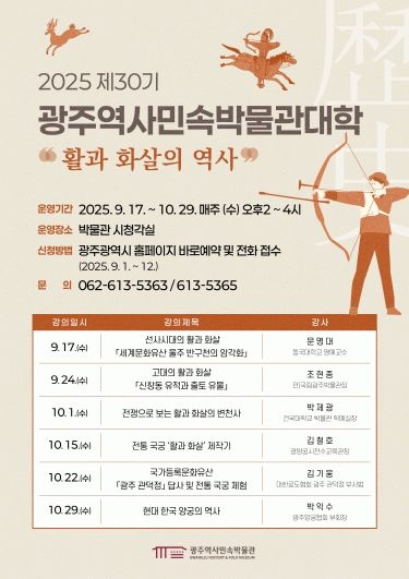 °Á´ ÃÑ 6ȸ·Î ±¸¼ºµÅ ¡ã¼±»ç½Ã´ëÀÇ È°°ú È»ì(¹®¸í´ë µ¿±¹´ë ¸í¿¹±³¼ö) ¡ã°í´ëÀÇ È°°ú È»ì-½Å⵿ À¯Àû(Á¶ÇöÁ¾ Àü ±¹¸³±¤ÁÖ¹Ú¹°°üÀå) ¡ãÀüÀïÀ¸·Î º¸´Â Ȱ°ú È»ìÀÇ º¯Ãµ»ç(¹ÚÁ¦±¤ °Ç±¹´ë ¹Ú¹°°ü Çп¹½ÇÀå) ¡ãÀüÅë ±¹±Ã Á¦ÀÛ±â(±èöȣ ±¤¾ç ±Ã½ÃÀü¼ö±³À°°üÀå) ¡ãÇö´ë Çѱ¹ ¾ç±ÃÀÇ ¿ª»ç(¹ÚÀͼö ±¤ÁÖ¾ç±ÃÇùȸ ºÎȸÀå) µî 5ȸÀÇ °ÀÇ¿Í ÇÔ²² ±¤ÁÖ °ü´öÁ¤ ´ä»ç ¹× ÀüÅë ±¹±Ã üÇèÀ» ÁøÇàÇÑ´Ù.