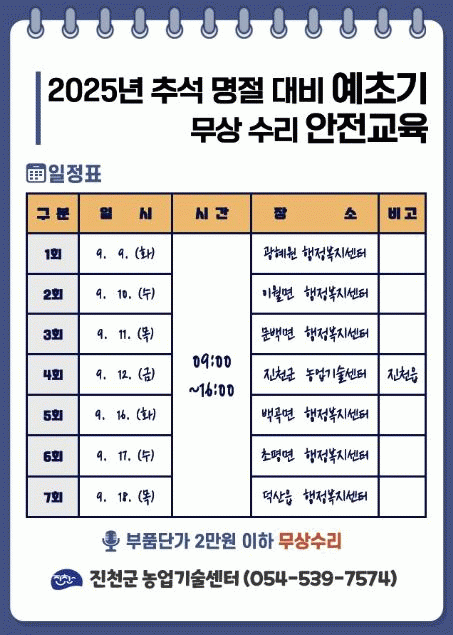 ±³À°Àº 9¿ù 9ÀÏ ±¤Çý¿øÀ» ½ÃÀÛÀ¸·Î 18ÀÏ(¸ñ)±îÁö °ü³» À¾¡¤¸é ÇàÁ¤º¹Áö¼¾ÅÍ¿Í ³ó¾÷±â¼ú¼¾ÅÍ¿¡¼ ¼øÂ÷ÀûÀ¸·Î ÁøÇàµÈ´Ù.