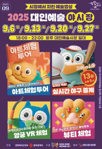 ±¤ÁÖ±¤¿ª½Ã´Â 9¿ù6ÀϺÎÅÍ 11¿ù22ÀϱîÁö(Ãß¼®¿¬ÈÞ 10¿ù 4Àϰú 11ÀÏ Á¦¿Ü) ¡®2025³â ÇϹݱ⠴ëÀο¹¼ú¾ß½ÃÀ塯À» ÃÑ 10ȸ ¿î¿µÇÑ´Ù.