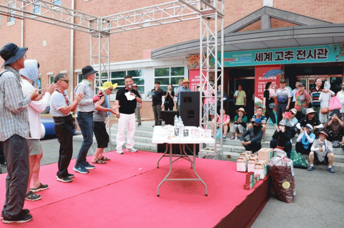 ¹«´ë¿¡¼´Â °íÃß °æ¸Å°¡ ÆîÃÄÁö¸ç, Âü°¡ÀÚµéÀº °æÇ°°ú ±«»êû°á°íÃ߸¦ ¼Õ¿¡ ³Ö±â À§ÇØ Ä¡¿ÇÑ È£°¡ÀüÀ» ¹ú¿´´Ù. ÇöÀåÀº ÇÔ¼º°ú ¿ôÀ½¼Ò¸®·Î °¡µæ á´Ù.