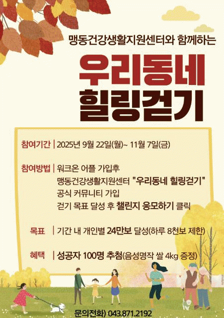 Âü¿© Èñ¸ÁÀÚ´Â ÀÌ´Þ 8ÀϺÎÅÍ ¸ð¹ÙÀÏ °È±â ¾Û ¡®¿öÅ©¿Â(WalkOn)¡¯À» ¼³Ä¡Çϰí À½¼º±º º¸°Ç¼Ò ¸Íµ¿°Ç°»ýȰÁö¿ø¼¾ÅÍ Ä¿¹Â´ÏƼ¿¡ °¡ÀÔÇÑ µÚ, ¡®¿ì¸®µ¿³× Èú¸µ°È±â¡¯ 縰Áö¸¦ ¿¹¾à¡¤½ÅûÇÏ¸é µÈ´Ù.