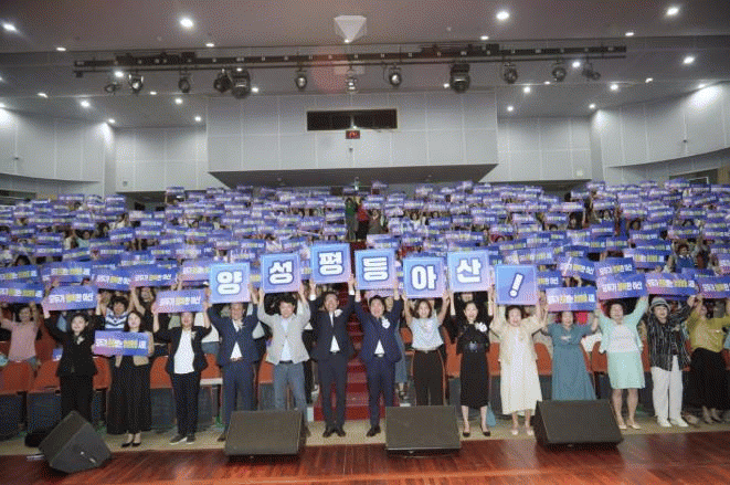 ¿À¼¼Çö ¾Æ»ê½ÃÀåÀº ¡°¾ç¼ºÆòµîÀº ¿ì¸® ¸ðµÎ°¡ ÇÔ²² ¸¸µé¾î°¡¾ß ÇÒ °øµ¿ÀÇ °¡Ä¡·Î, ¾Æ»ê½Ã´Â °æ·Â´ÜÀý ¿©¼º Áö¿ø°ú ¾ç¼ºÆòµî ±³À°À» ÅëÇØ ¼ºÂ÷º° ÇØ¼Ò¿¡ Èû½á¿Ô´Ù¡±¸ç ¡°À̹ø ±â³äÇà»ç°¡ ¡®¸ðµÎ°¡ Á¸Áß¹Þ´Â ¾ç¼ºÆòµî »çȸ, ¸ðµÎ°¡ ÇູÇÑ ¾Æ»ê¡¯À» ¸¸µé¾î°¡´Â °è±â°¡ µÇ±â¸¦ ¹Ù¶õ´Ù¡±°í ¸»Çß´Ù.