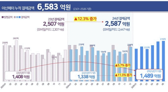 ¡®¾Æ»êÆäÀÌ(¸ð¹ÙÀÏ¡¤Ä«µå) ¹ßÇà ¿î¿µ ºÐ¼® º¸°í¼¡¯¿¡ µû¸£¸é, 2023³â 1¿ùºÎÅÍ 2025³â 6¿ù±îÁö ÃÑ ´©Àû °áÁ¦¾×Àº 6,583¾ï ¿øÀ» ±â·ÏÇß´Ù.