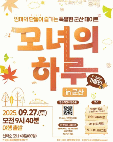 Âü°¡ºñ´Â 1Àδç 40,000¿øÀ¸·Î ÇÁ·Î±×·¥ Âü¿©´Â ±º»ê½Ã °ø½Ä »çȸ°ü°è¸Á(SNS) °èÁ¤(ÀνºÅ¸±×·¥), ±º»ê K-°ü±¤¼¶ °èÁ¤(ÀνºÅ¸±×·¥) ¡®¸ð³àÀÇÇÏ·ç in ±º»ê K-°ü±¤¼¶(°¡À»Æí)¡¯ °Ô½Ã±Û ³» QR ºÎÈ£(ÄÚµå)¸¦ ÅëÇØ ½ÅûÇÒ ¼ö ÀÖ´Ù.