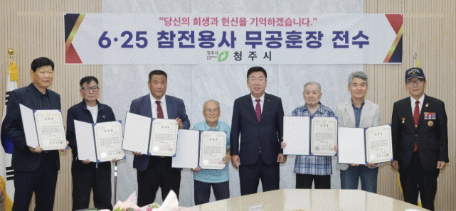 ÀÓ½Ãû»ç Á÷Áö½Ç¿¡¼ °³ÃÖµÈ ¹«°øÈÆÀå Àü¼ö½Ä¿¡¼ À̹ü¼® ûÁÖ½ÃÀåÀº 6¡¤25 ÀüÀï¿¡ ÂüÀüÇØ °øÀûÀ» ¼¼¿î ͺ ±èÀ̰© ÀϺ´, ͺ ¹ÚÁؼ± ÀϺ´, ͺ À±Á¤±Ç º´Àå, ͺ ÀÌ±Ô»ï º´Àå, ͺ ÀÌÂù¿µ º´Àå, ͺ ÃÖ¿îÇÐ »óº´ÀÇ À¯Á·¿¡°Ô ȶû¹«°øÈÆÀåÀ» Àü¼öÇß´Ù.