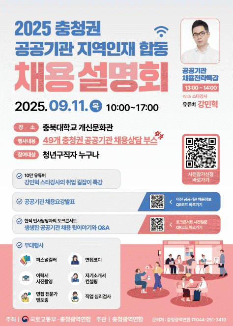 À̹ø ÇÕµ¿Ã¤¿ë¼³¸íȸ´Â ÃæÃ»±Ç °ø°ø±â°ü Ãë¾÷¿¡ °ü½É ÀÖ´Â Ãë¾÷Áغñ»ýÀ̶ó¸é ´©±¸³ª Âü¿© °¡´ÉÇϸç, »çÀü½ÅûÀº È«º¸ Æ÷½ºÅÍÀÇ QRÄڵ带 ÅëÇØ °£ÆíÇÏ°Ô ÁøÇàÇÒ ¼ö ÀÖ´Ù.