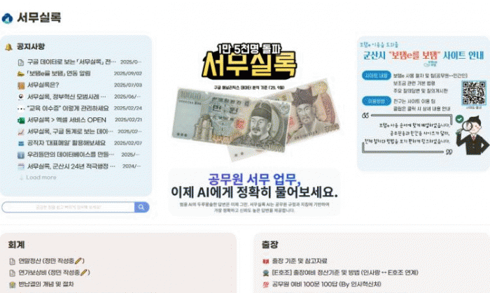 ¡®¼¹«½Ç·Ï¡¯Àº ±º»ê½Ã µðÁöÅÐÁ¤º¸´ã´ç°ü ±Ç¿µ, ÀÌÁ¤¹Î ÁÖ¹«°üÀÌ °³¹ßÇÑ ÀΰøÁö´É(AI) ±â¹ÝÀÇ Çù¾÷Çü ¿Â¶óÀÎ ¾÷¹« ¸Å´º¾óÀÌ´Ù.