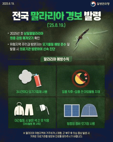 ¸»¶ó¸®¾Æ ¿¹¹æÀ» À§Çؼ´Â ¡ã¸ð±â ±âÇÇÁ¦ »ç¿ë, ¡ã¾ß°£È°µ¿ ÀÚÁ¦, ¡ã¾ß°£È°µ¿ ½Ã ¹àÀº»ö ±ä ¿Ê Âø¿ë, ¡ã ¾ß¿ÜȰµ¿ ÈÄ »þ¿ö, ¡ã°¡Á¤¿ë ¹æÃæ¸Á Á¤ºñ ¹× ¸ð±âÀå »ç¿ë µîÀÇ ¿¹¹æ¼öÄ¢À» öÀúÈ÷ ÁöÄÑ¾ß ÇÑ´Ù.