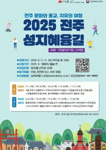 ½Ã´Â 9¿ùºÎÅÍ 11¿ù±îÁö ¸ÅÁÖ ¸ñ¿äÀÏ 1¹Ú 2ÀÏ·Î ÃÑ 10ȸ¿¡ °ÉÃÄ ÀüÁÖÀÇ ¿ª»ç¿Í Á¾±³, ¹®È¸¦ üÇèÇÒ ¼ö ÀÖ´Â Áö¿ªÆ¯È Ä¡À¯¼ø·Ê ÇÁ·Î±×·¥ÀÎ ¡®2025 ÀüÁÖ ¼ºÁöÇýÀ³±æ¡¯À» ÁøÇàÇÑ´Ù°í 9ÀÏ ¹àÇû´Ù.