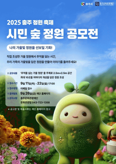 °ø¸ð´Â Á¤¿ø Á¶¼º¿¡ °ü½É ÀÖ´Â ´ëÇѹα¹ ±¹¹Î ´©±¸³ª Âü¿©ÇÒ ¼ö ÀÖÀ¸¸ç, Á¢¼ö´Â 9¿ù 11ÀϺÎÅÍ 9¿ù 22ÀÏ ¿ÀÈÄ 5½Ã±îÁö ÃæÁÖ¹®È°ü±¤Àç´Ü ȨÆäÀÌÁö¸¦ Âü°íÇØ ½Åû ¹× ¼³¸í¼ 1ºÎ¸¦ À̸ÞÀÏ·Î Á¦ÃâÇÏ¸é µÈ´Ù.