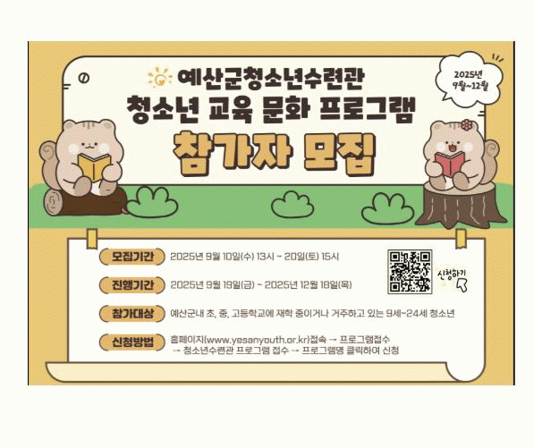Âü°¡ ½ÅûÀº ¿¹»ê±ºÃ»¼Ò³âº¹ÁöÀç´Ü ȨÆäÀÌÁö ³» û¼Ò³â¼ö·Ã°ü ÇÁ·Î±×·¥ Á¢¼ö ¸Þ´º¿¡¼ °¡´ÉÇϸç, ÇÁ·Î±×·¥º° ½Åû ¿¬·É°ú ¸ðÁý Á¤¿øÀÌ ´Ù¸£¹Ç·Î ¹Ýµå½Ã ¾È³»¹®À» È®ÀÎÇØ¾ß ÇÏ°í ¼±Âø¼ø ¸ðÁýÀ¸·Î Á¶±â ¸¶°¨µÉ ¼ö ÀÖ´Ù.
