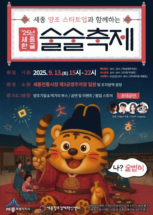 ¼¼Á¾Æ¯º°ÀÚÄ¡½Ã´Â ¿À´Â 13ÀÏ ¿ÀÈÄ 3½ÃºÎÅÍ 10½Ã±îÁö ¼¼Á¾ÀüÅë½ÃÀå Á¦3°ø¿µÁÖÂ÷Àå ÀÏ¿ø°ú Á¶Ä¡¿ø¿ª ±¤Àå¿¡¼ ¡®Çѱ۷Πºú°í, ¼ú·Î ÀÕ´Ù¡¯¸¦ ÁÖÁ¦·Î ¡®¼¼Á¾ ÇÑ±Û ¼ú¼úÃàÁ¦¡¯¸¦ °³ÃÖÇÑ´Ù°í ¹àÇû´Ù.