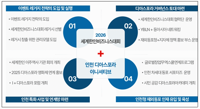 ƯÈ÷ À̹ø ¿¬±¸´Â 2026³â ÀÎõ¿¡¼ °³ÃÖ ¿¹Á¤ÀÎ ¼¼°èÇÑÀκñÁî´Ï½º´ëȸ¸¦ Áß½ÉÀ¸·Î, À§ÀÇ ³× °¡Áö Àü·«À» Á¾ÇÕÀûÀ¸·Î ½ÇÇàÇÏ´Â Á¤Ã¥ ÇÁ·¹ÀÓ¿öÅ©·Î¼ ¡®ÀÎõ µð¾Æ½ºÆ÷¶ó ÀÌ´Ï¼ÅÆ¼ºê(Incheon Diaspora Initiative, IDI)¡¯ÀÇ ÃßÁøÀ» Á¦¾ÈÇß´Ù.