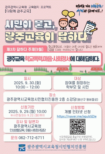 ±¤ÁÖ±³À°¿¡ °ü½ÉÀÌ ÀÖ´Â Çкθ𡤽ùÎÀº ¿À´Â 29ÀÏ ¿ÀÀü 10½Ã±îÁö ¿Â¶óÀÎÀ¸·Î ½ÅûÇÏ¸é µÈ´Ù. ´Ü, »çÀü ÁúÀÇ Á¢¼ö´Â ¿À´Â 22ÀϱîÁö´Ù.