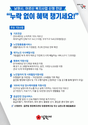 ³ëÀÎÀÏÀÚ¸® »ç¾÷Àº ¸Å³â 12¿ù, ³²¿ø½Ã´Ï¾îŬ·´¡¤³²¿ø½Ã³ëÀκ¹Áö°ü¡¤´ëÇѳëÀÎȸ ³²¿ø½ÃÁöȸ µî 7°³ ¼öÇà±â°ü°ú À¾¸éµ¿À» ÅëÇØ °ø°í°¡ ÁøÇàµÇ¸ç, ³»³âµµ Âü¿©ÀÚ¸¦ ¸ðÁýÇÑ´Ù.