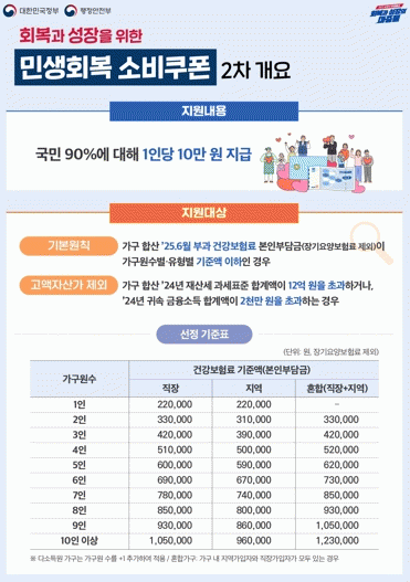 2Â÷ ¹Î»ýȸº¹ ¼ÒºñÄíÆùÀº 1Àδç 10¸¸¿ø¾¿ Áö±ÞµÉ ¿¹Á¤À̸ç, 2025³â 6¿ù ºÎ°ú º»Àκδ㠰ǰº¸Çè·á °¡±¸º° ÇÕ»ê¾×ÀÌ ¼±Á¤±âÁØ ÀÌÇÏÀÎ °æ¿ì Áö±Þ´ë»óÀÚ°¡ µÈ´Ù. °¡±¸¿øÀÇ 2024³â Àç»ê¼¼ °ú¼¼Ç¥ÁØ ÇÕ°è¾×ÀÌ 12¾ï¿øÀ» ÃʰúÇϰųª, 2024³â ±Í¼Ó ±ÝÀ¶¼Òµæ ÇÕ°è¾×ÀÌ 2õ¸¸ ¿øÀ» ÃʰúÇÏ´Â °æ¿ì ÇØ´ç °¡±¸ÀÇ °¡±¸¿ø ¸ðµÎ°¡ Áö±Þ ´ë»ó¿¡¼ Á¦¿ÜµÈ´Ù.