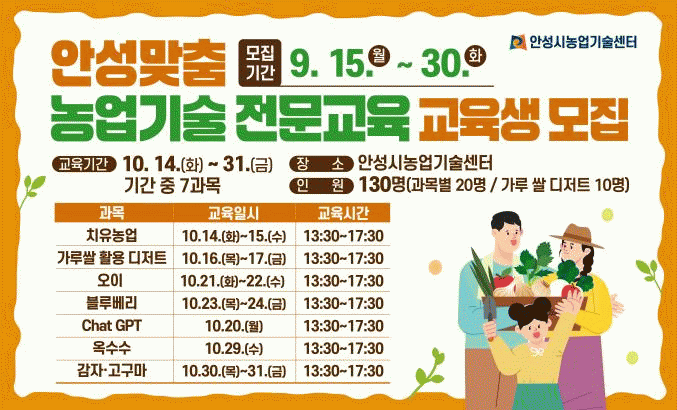À̹ø ±³À°Àº Ä¡À¯³ó¾÷, °¡·ç½Ò Ȱ¿ë µðÀúÆ®, ¿ÀÀÌ Àç¹è±â¼ú, ºí·çº£¸® Àç¹è±â¼ú, ¿Á¼ö¼ö Àç¹è±â¼ú, °¨ÀÚ¡¤°í±¸¸¶ Àç¹è±â¼ú, ³ó¾÷¿¡¼ Ȱ¿ëÇÏ´Â Chat Gpt ÃÑ 7°ú¸ñÀ¸·Î ±¸¼ºµÇ¾îÀÖÀ¸¸ç 10¿ù Áß 7ȸ°£ ¿î¿µÀÌ µÈ´Ù.