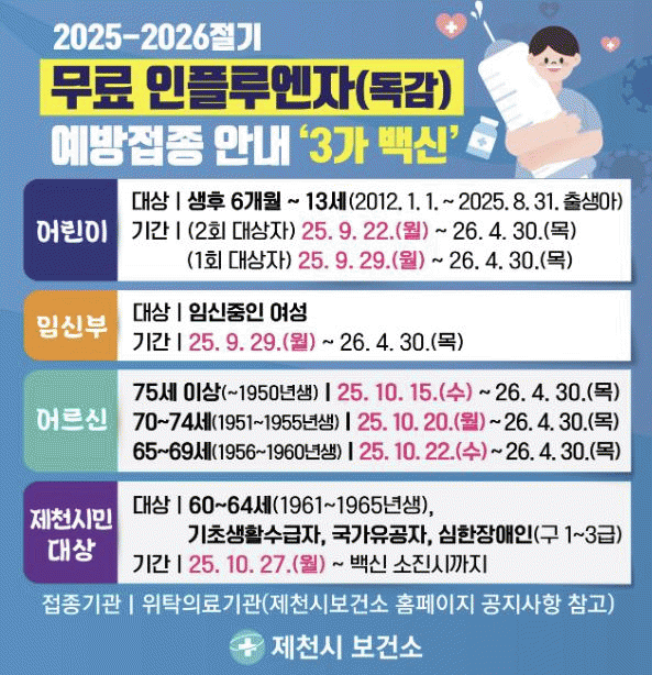 ÀÎÇ÷翣ÀÚ(µ¶°¨) ¿¹¹æÁ¢Á¾Àº º°µµ ¿¹¾à ¾øÀÌ ½ÅºÐÁõ ¹× Áõºù¼·ù(¼ö±ÞÀÚ Áõ¸í¼, ±¹°¡À¯°øÀÚÁõ, Àå¾ÖÀκ¹ÁöÄ«µå µî)¸¦ ÁöÂüÇÏ¿© °ü³» À§Å¹ÀÇ·á±â°üÀ» ¹æ¹®ÇÏ¸é ³»³â 4¿ù 30ÀϱîÁö ¹«·á Á¢Á¾ÀÌ °¡´ÉÇϸç, ÀÎÇ÷翣ÀÚ À§Å¹ÀÇ·á±â°üÀº Á¦Ãµ½Ã º¸°Ç¼Ò ´©¸®Áý °øÁö»çÇ× ¶Ç´Â ¿¹¹æÁ¢Á¾µµ¿ì¹Ì »çÀÌÆ®¿¡¼ È®ÀÎÇÒ ¼ö ÀÖ´Ù.