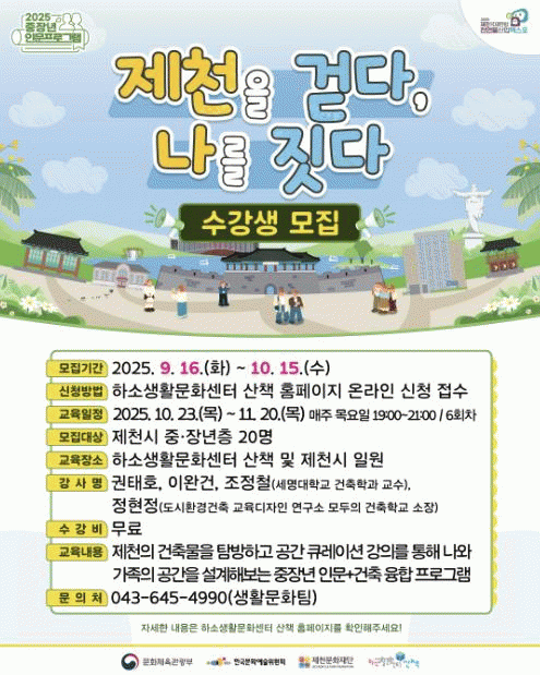 ±³À°ºñ´Â ¹«·áÀ̸ç, ½ÅûÀº 9¿ù 16ÀϺÎÅÍ 10¿ù 15ÀϱîÁö ÇϼһýȰ¹®È¼¾ÅÍ »êÃ¥ ´©¸®Áý¿¡¼ ¼±Âø¼øÀ¸·Î Á¢¼öÇÒ ¼ö ÀÖ´Ù.