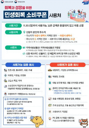 7¿ù21ÀϺÎÅÍ 9¿ù12ÀϱîÁö 8ÁÖ°£ Áö±ÞµÈ 1Â÷ Áö±Þ¿¡¼´Â Áö±Þ´ë»óÀÚÀÇ 99.3%ÀÎ 46,884¸í¿¡°Ô ÃÑ104¾ï 3,200¸¸ ¿øÀÇ ¼ÒºñÄíÆùÀ» Áö±ÞÇßÀ¸¸ç, ¿À´Â 22ÀϺÎÅÍ 10¿ù 31ÀϱîÁö 6ÁÖ°£ 2Â÷ Áö±ÞÇÏ¿© ¹Î»ý°æÁ¦¿Í ¼Òºñȸº¹ÀÇ È帧À» À̾°¥ ¿¹Á¤ÀÌ´Ù.