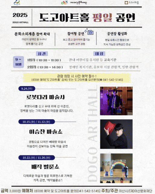 °ø¿¬Àº 1ȸÂ÷(10:30) ±³À°±â°ü(¾î¸°ÀÌÁý¡¤À¯Ä¡¿ø) ´Üü¸¦ ´ë»óÀ¸·Î, 2ȸÂ÷(13:30) Àå¾ÖÀÎ º¹Áö±â°ü°ú ¿µÀ¯¾Æ µ¿¹Ý °¡Á·, ÀÏ¹Ý °ü¶÷°´À» ´ë»óÀ¸·Î ¿î¿µµÈ´Ù. ȸÂ÷º° ¿î¿µ ¹æ½ÄÀ¸·Î ´Ù¾çÇÑ °èÃþÀÇ Âü¿© ±ÕÇüÀ» ¸ÂÃß°í, ÆòÀÏ À¯È޽ð£À» Ȱ¿ëÇØ °ø¿¬Àå Ȱ¼ºÈ¿¡ ±â¿©ÇÑ´Ù.