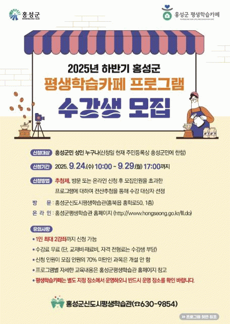 ¼ö° ½ÅûÀº ¿À´Â 24ÀÏ 10½ÃºÎÅÍ 9¿ù 29ÀÏ 17½Ã±îÁö ÁøÇàµÇ¸ç, ½Åµµ½ÃÆò»ýÇнÀ°ü ¹æ¹® Á¢¼ö ¶Ç´Â È«¼º±ºÆò»ýÇнÀ°ü ȨÆäÀÌÁö¿¡¼ ¿Â¶óÀÎ Á¢¼ö °¡´ÉÇÏ´Ù. 1ÀÎ ÃÖ´ë 2°Á±îÁö ½Åû °¡´ÉÇϸç, ¼ö°·á´Â ¹«·áÀ̳ª ¼ö¾÷¿¡ µû¸¥ Àç·áºñ¡¤±³Àçºñ ¹× ÀÚ°Ý ÀüÇü·á´Â ¼ö°»ý ºÎ´ãÀÌ´Ù.