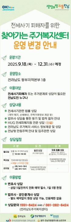 ƯÈ÷ Àü³²µµ°¡ Áö³ 1³â µ¿¾È ±¹Åä±³ÅëºÎ¿Í ÁÖÅõµ½Ãº¸Áõ°ø»ç¿¡ Àü¹®Àη ÆÄ°ßÀ» Áö¼ÓÀûÀ¸·Î ¿äÃ»ÇØ ÁÖÅõµ½Ãº¸Áõ°ø»ç(HUG)ÀÇ Àü¼¼»ç±âÇÇÇØ Àü´ã±â±¸ÀÎ ¼¿ï °æ¡¤°ø¸ÅÁö¿ø¼¾ÅÍ Àü¹®Àηµµ »õ·Ó°Ô Âü¿©ÇÑ´Ù.