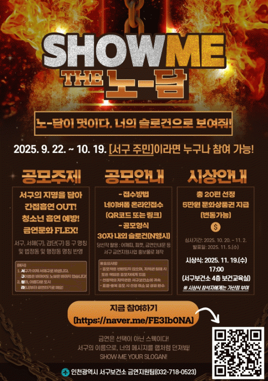 °ø°øÀå¼Ò¿¡¼ÀÇ °£Á¢Èí¿¬ ÇÇÇØ, û¼Ò³â Èí¿¬ ¿¹¹æ, ±Ý¿¬ ¹®È È®»ê µî ±Ý¿¬ ¹× Èí¿¬ ¿¹¹æ ȯ°æ Á¶¼º¿¡ ±â¿©ÇÒ ¼ö ÀÖ´Â ³»¿ëÀ» ´ãÀº ½½·Î°ÇÀ» ¡®¼±¸¡¯ Áö¸íÀ» Ȱ¿ëÇÑ NÇà½Ã Çü½ÄÀ¸·Î Á¦ÃâÇÏ¸é µÈ´Ù.